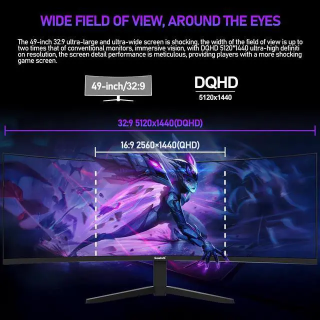 THE ULTIMATE DQHD ULTRAWIDE EXPERIENCE - Immerse yourself in the pinnacle of display technology with our 49 inch curved DQHD ultrawide monitor. Boasting an expansive 51201440 resolution, true HDR10 support, and a buttery-smooth 120Hz refresh rate, this monitor delivers breathtaking visuals whether you're gaming or working. The 32:9 aspect ratio and 1500R curvature wrap around your vision, making it easier to manage multiple applications, view wide financial charts, or edit long video timelines without scrolling. ^^ GAMING PERFORMANCE REDEFINED - Gamers will appreciate the 120Hz refresh rate that eliminates motion blur in fast-paced titles.