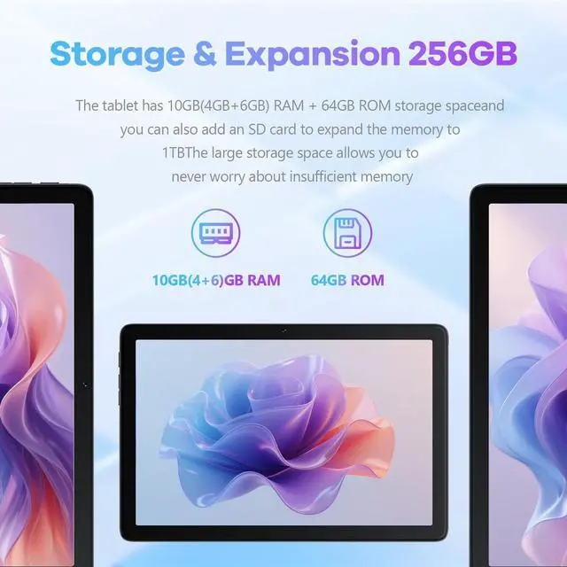 Powerful Performance TabletExperience seamless multitasking with this 10.1 -inch Android 14 tablet, powered by an octa-core A523 CPU ( 1.8GH z) and 10GB RAM (4GB+6GB expandable). The 22nm Cortex-A55 architecture ensures smooth streaming, gaming, and productivity. ^^ Premium Metal-Body TabletSleek and durable, this metal-clad tablet features a vibrant 10.1" IPS display (1280x800) with scratch-resistant G+G glass. Perfect for reading, browsing, and HD video playback on the go. ^^ Expandable Storage TabletNever run out of space! This Android tablet offers 64GB ROM + TF card support, ideal for storing apps, photos, and videos.