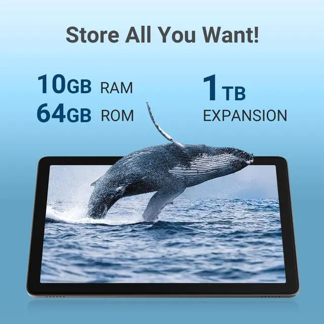 The anti-glare IPS panel delivers 178 wide viewing angles and vibrant colors, ideal for binge-watching movies, sketching with precision, or reviewing documents. Combined with the octa-core processors Mali-G52 GPU, it ensures buttery-smooth visuals for high-definition content and dynamic mobile gaming. ^^ Ample 10GB RAM + Expandable Storage for Heavy WorkloadsNever compromise on productivity with 10GB hybrid RAM (4GB physical + 6GB virtual expansion via dynamic memory allocation) that accelerates app switching and background processes. The 64GB built-in storage offers ample space for apps, photos, and files, while the TF card slot supports up to 512GB expansion for media libraries or work documents.