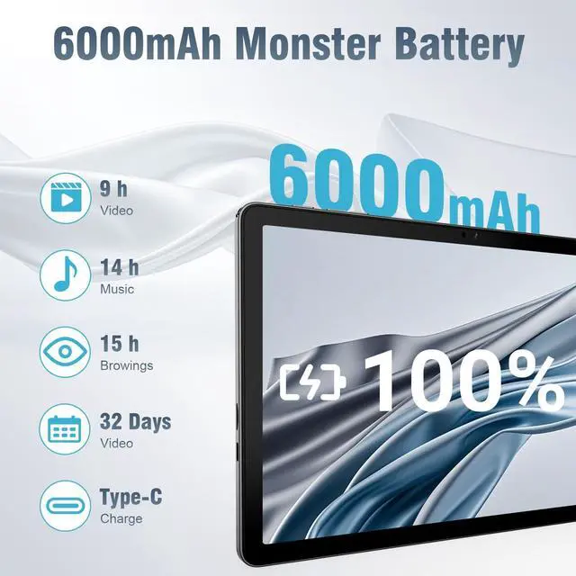 Feel free to download and store your favorite content, and say goodbye to the worry of running out of memory. ^^ 6000 mAh & 5MP+8MP Dual CameraThe tablet comes with a 6000 mAh battery with high battery life for long hours of operation, whether it's for work, study or entertainment; this 10.1 -inch tablet also has a 5MP front camera and a 8MP rear camera which will satisfy both photography and video-calling needs. ^^ Wi-Fi +Bluetooth 5.0 +Split-Screen This Android 14 tablet supports WiFi 6 and Bluetooth 5.0, built-in 5G WiFi and 2.4G WiFi dual-band WIFI chip for more stability; Bluetooth 5.0 for faster and more stable connection with other Bluetooth devices.