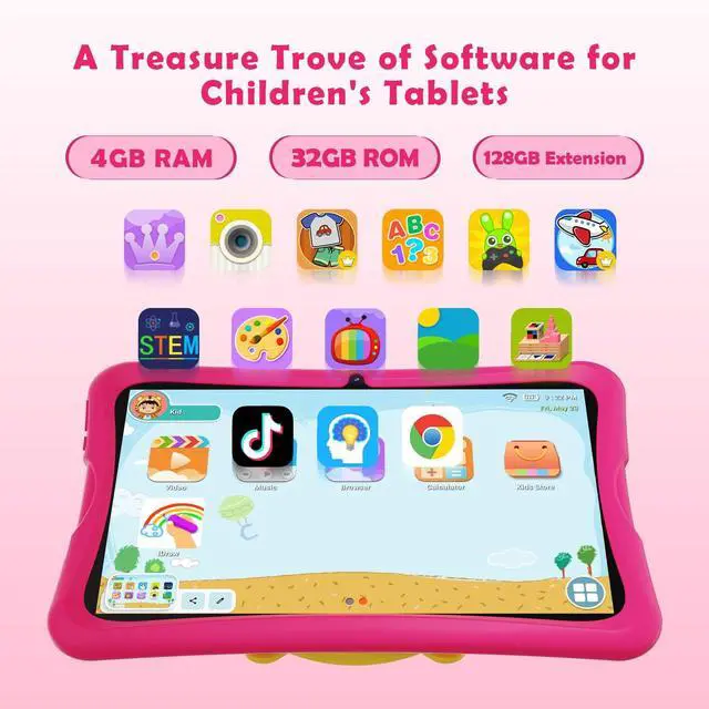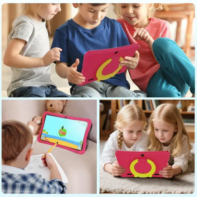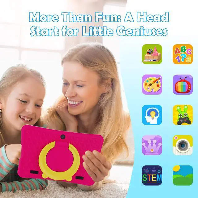 APP with parental control: This tablet has passed the GMS certification and is pre-installed with the iwawa app, specially designed for children. It has password control, remote video control, one-button lock screen, alarm setting, and Learning, art, smart games. New upgrade kids online school, fun interaction, video playback, word collection. You can also download unlimited free learning and gaming applications in the store, such as movies, games, and music. ^^ 6000mAh LARGE BATTERY This rugged kids tablet built-in a 6000mAh large battery, you will freely enjoy reading or watching videos for 6-8hours on a full charge. No need to worry about the battery while you are traveling on the way. ^^ Ideal Gift ChoiceThis Kids tablet with slim and compact body, with soft and lightweight protective case, more durable, it can protect your tablet when drops. And the adjustable plastic stand can stand tablet stable, you not need to hold the tablet all the time. This tablet PC can bring a lot of fun and knowledge for your kids. learning while playing. The toddler tablet is an ideal gift for birthday, Christmas, holiday season etc.