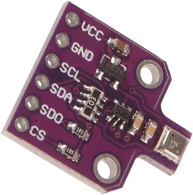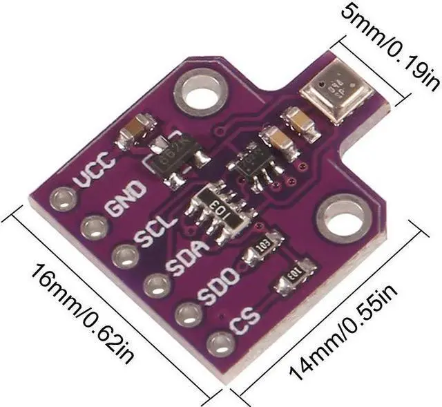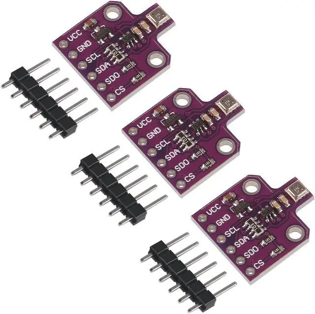 Sturdy ( 1.6 mm), purple PCB with a 6-pin header on on side (VCC, GND, SDA/SDI, SCL/SCK, SDO, and CS)