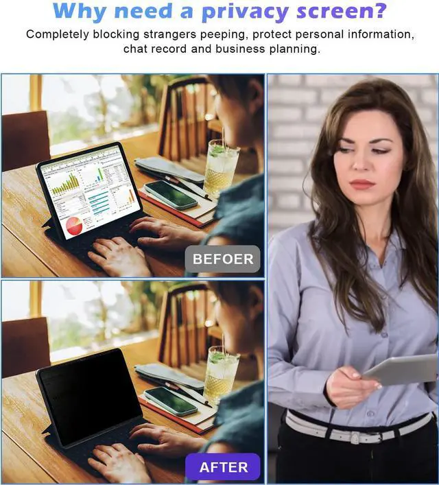 [(Privacy on the Go)] Magnetic ipad 11th/10th Generation Privacy Screen Protector (Landscape) hides your sensitive and private information from strangers in public places. In horizontal/landscape mode, easy to add full screen privacy to the iPad, your content is invisible in the view of more than 30 degrees. When not in use, it can be safely and conveniently stored in the attached folder, making travel and remote work safe and reliable when you need privacy most.