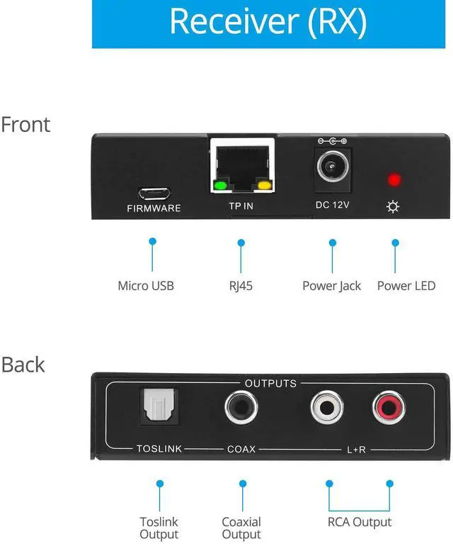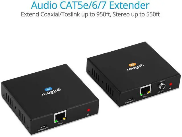 gofanco Audio Extender Over CAT5e / CAT6 - Coaxial/Toslink/RCA Stereo, 950ft (290m) Extension, Embedded DAC & ADC, PoC, Up to 7.1 -Channel, Supports Dolby Digital, DTS, PCM, Stereo (AudioCATExt33)