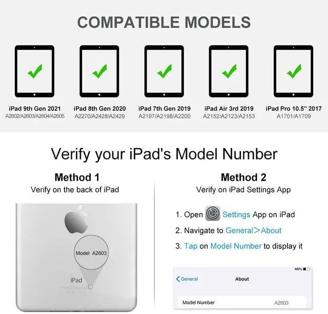 1.[(iPad KEYBOARD CASE WIDE COMPATIBILITY)] This iPad keyboard case is designed for new iPad 9th Gen 10.2 inch 2021(Model NO.:A2602/A2603/A2604/A2605), iPad 8th Gen 10.2 inch 2020(Model NO.:A2270/A2428/A2429/A2430), iPad 7th Gen10.2 inch 2019 release(Model NO. - A2197/A2198/A2200), iPad Air 3 10.5" 2019(Model NO.:A2152/A2123/A2153) and iPad Pro 10.5 inch 2017 released (Model NO.: A1701/A1709). Please check the model number starting with "A" on the back of your iPad before purchasing.