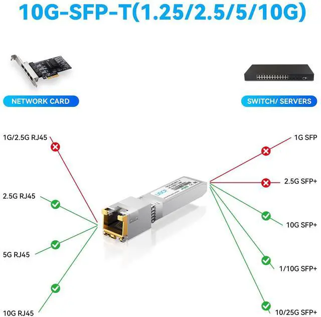 [(Adaptive Speeds)] This 10G SFP+ to RJ45 module supports automatic speed negotiation from 1.25G to 10G, delivering seamless, high-speed connections across various network setups.