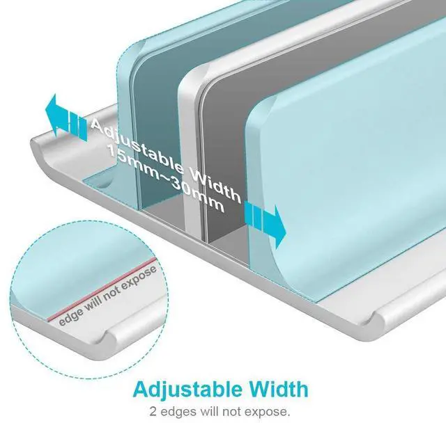 Adjustable Size: Adjustable slot width for laptop whose thickness is from 0.63in /16mm to 2.36in / 60mm, you could adjust the width of this vertical laptop stand by the screws to fit in different laptops.