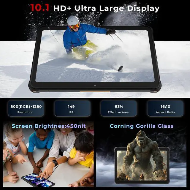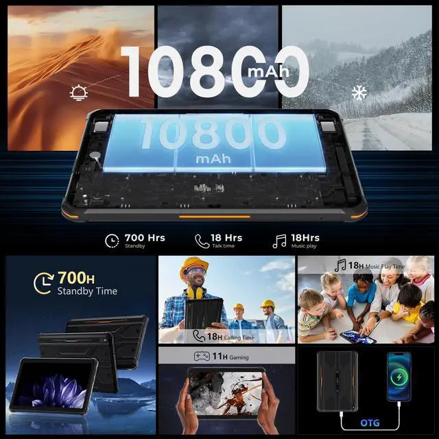 10800mAh Ultra Large Battery & OTGHOTWAV R8 Rugged tablet with a massive 10800mAh battery. Enjoy up to 700 hours of standby time and 18 hours of talk time. Whether you're streaming videos, browsing the web, or playing games, you can rely on the tablet to keep up with your busy lifestyle. In addition, R8 outdoor tablet features OTG reverse charging, whether you're traveling or working, stay powered up effortlessly. Ideal for outdoor enthusiasts, campers, hikers, and adventurers.