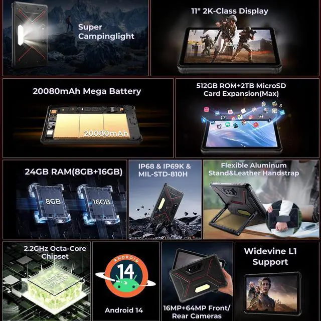 HOTWAV R9 Plus Rugged Tablet 11 inch Android 14 Tablets, 20080mAh Waterproof Tablet, 2K 24GB+512GB/2TB TF Work Tablets, 64MP+16MP Octa-Core IP68&IP69K/4G Dual SIM/5G WiFi/Face ID/GPS/OTG