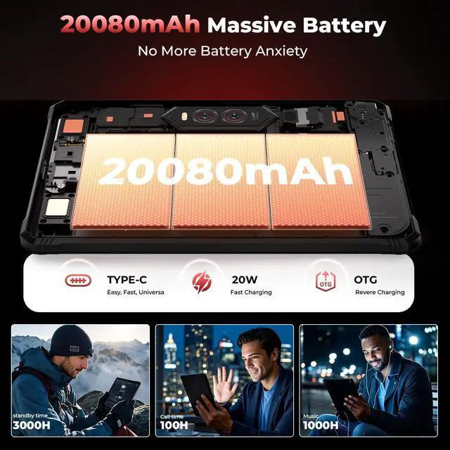 20080mAh Battery & OTG + 20W Fast ChargingHOTWAV R9 Plus tablets for adults is equipped with a 20080mAh large capacity battery, providing you with an ultra-long battery life. Enjoy up to 3000 hours of standby time and 100 hours of talk time worry-free, backed by 20W fast charging. Whether you're traveling or working, stay powered up effortlessly. The R9 Plus tablet rugged supports OTG reverse charging, it not only works as a outdoor work tablets, also can work as a power bank