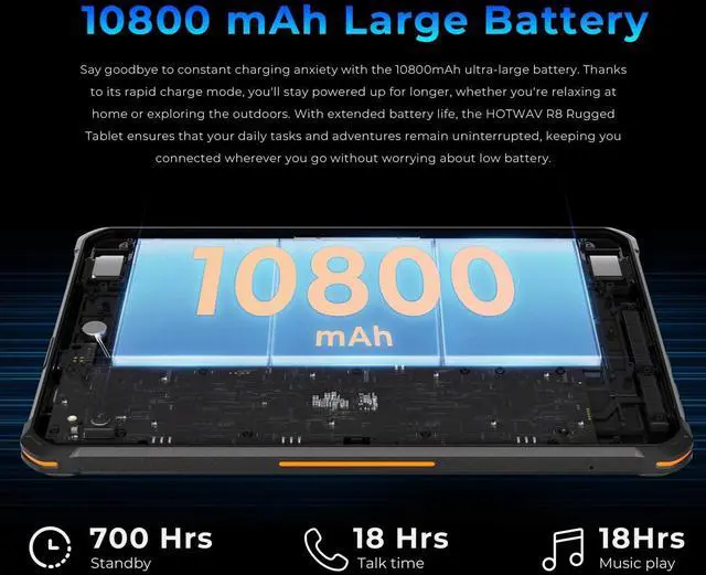 The Ultimate Powerhouse: 10800mAh Battery & Reverse Charging Never be tethered to a wall again. With a massive 10800mAh battery, the R8 isn't just a tabletits a survival tool. Enjoy an incredible 1000 hours of standby or 200 hours of talk time on a single charge. Thanks to its OTG Reverse Charging, the R8 doubles as a high-capacity power bank, ready to rescue your smartphone, GPS, or earbuds when you're miles from the nearest outlet. ^^ Stay ahead, stay secure. Experience the future of mobile OS with Android