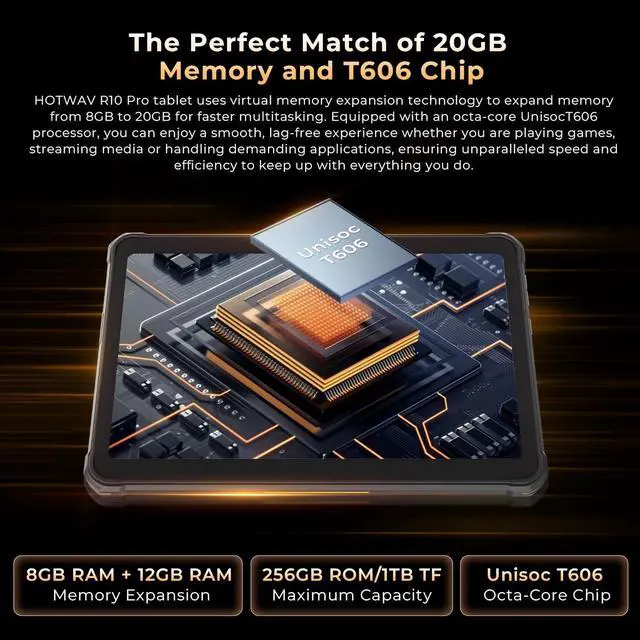 New Tablet in 2025In 2025, HOTWAV launched the new R10 Pro three-proof tablet computer! It is not only a device, but also a reliable partner for you to explore the world. It adopts military-grade protection design, anti-fall, waterproof and dustproof. Whether it is outdoor adventure or daily use, it can easily cope with it. It is only 1.5 cm thick, light and portable, and can be held in one hand without pressure, so you can start an efficient life anytime, anywhere. ^^ 20GB+256GBThe new 2025 HOTWAV R10 Pro rugged tablet is equipped with virtual expansion technology, and the memory is increased from 8GB to 20GB, which can easily handle multi-tasking; the R10 Pro android tablet is equipped with 256GB of ultra-large storage space, and massive files can be stored at will; built-in powerful octa-core processor, faster running speed, more stable performance, bringing you the ultimate smooth experience! ^^ 10.1" HD+ ScreenThe 2025 new HOTWAV R10 Pro rugged tablet is equipped with a 10.1 -inch high-definition large screen with a screen-to-body ratio of up to 93%, bringing an immersive visual experience; the R10 Pro outdoor tablet screen has a maximum brightness of 450nit, and can display clearly even in strong outdoor light; the tablet uses ultra-high-definition screen glass, with accurate color reproduction and delicate and realistic pictures.