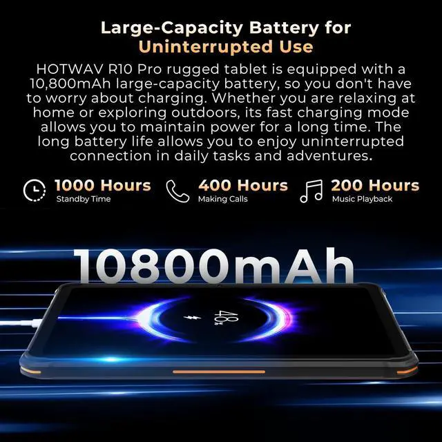 Whether watching movies, playing games or working, you can enjoy the ultimate visual feast! ^^ 10800mAh BatteryThe 2025 new HOTWAV R10 Pro rugged tablet has a built-in 10800mAh large battery, and its battery life meets the needs of long-term use; the R10 Pro tablet supports OTG mutual charging function, which can charge other devices at critical moments and become a portable power bank; the ultra-long battery life is amazing, with a standby time of up to 1500 hours, a talk time of up to 200 hours, and a music playback time of up to 400 hours.
