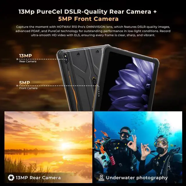 Whether it is work, entertainment or outdoor adventure, it can accompany you throughout the process without worrying about power! ^^ 13MP Ultra-HD CameraHOTWAV R10 Pro rugged tablet uses 4 pieces of ultra-HD glass on the main camera, with a maximum pixel of 13MP, to record beautiful moments with clear pictures. R10 Pro waterproof tablet also has the function of underwater shooting, you can shoot for a short time underwater, and the versatile shooting options allow you to choose your favorite shooting technique. ^^ Super strong defenseHOTWAV R10 Pro rugged tablet has passed the international standard assessment test.
