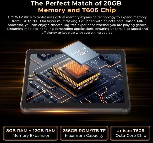 2025 Upgrade Rugged Tablet + IP68, IP69K & MIL-STD-810The HOTWAV R10 Pro waterproof tablet meets IP68, IP69K, and MIL-STD-810G standards. It offers 30 minutes of water resistance at depths of up to 1.5 meters, 1.2 -meter drop protection, and 360 dustproof capability. The latest HOTWAV R10 Pro rugged Android tablet is ideal for outdoor sports enthusiasts and professionals such as welders, mechanical maintenance technicians, and heavy industry workers ^^ Massive 20GB RAM & 256GB Storage (Expandable up to 1TB) The HOTWAV R10 Pro rugged waterproof tablet redefines multitasking with 8GB of built-in RAM and an additional 12GB of virtual RAM expansion.
