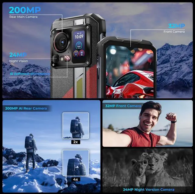 With 33W fast charging, you can power up in no time, and the OTG reverse charging feature lets you use this celular caterpillar as a power bank to charge other devices. Perfect for adventures, emergencies, or daily heavy use! ^^ Professional-Grade Camera SystemThis rugged phone is a camera powerhouse! The 200MP ultra-high-resolution main sensor captures stunning, detailed photos, while the 32MP front camera ensures perfect selfies. Plus, the 24MP night vision camera lets you take clear, bright shots even in complete darkness. With the HOTWAV Hyper 7 Pro unlocked phones, every moment becomes a masterpiece! ^^ Ultimate Rugged ProtectionThe HOTWAV Hyper 7 Pro waterproof phone is virtually indestructible, thanks to its triple military-grade certifications (IP68, IP69K, and MIL-STD-810H).