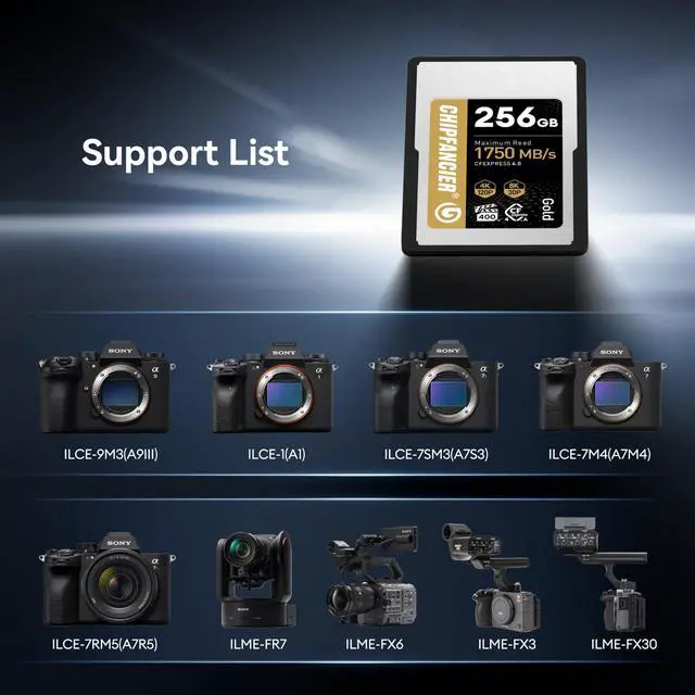 Compatible with Sony Alpha & FX CamerasCHIPFANCIER 968GB CFexpress 4.0 Type A card compatible with Sony Alpha and FX cameras including a1, a7SIII, a7IV, a7rV, a9III, FX3, FX6, FR7, and FX30; as well as CFexpress Type A memory card