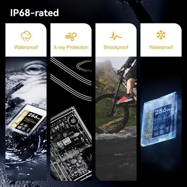 Stable Performance CHIPFANCIER 968GB cfexpress 4.0 type A card provides max read speeds up to 1750 MB/s, write speeds up to 1750 MB/s, with sustained write speed 1500MB/s. Speeds based on internal testing. Actual transfer ates and capacity may vary depending on host device, file attributes, system hardware and other factors.