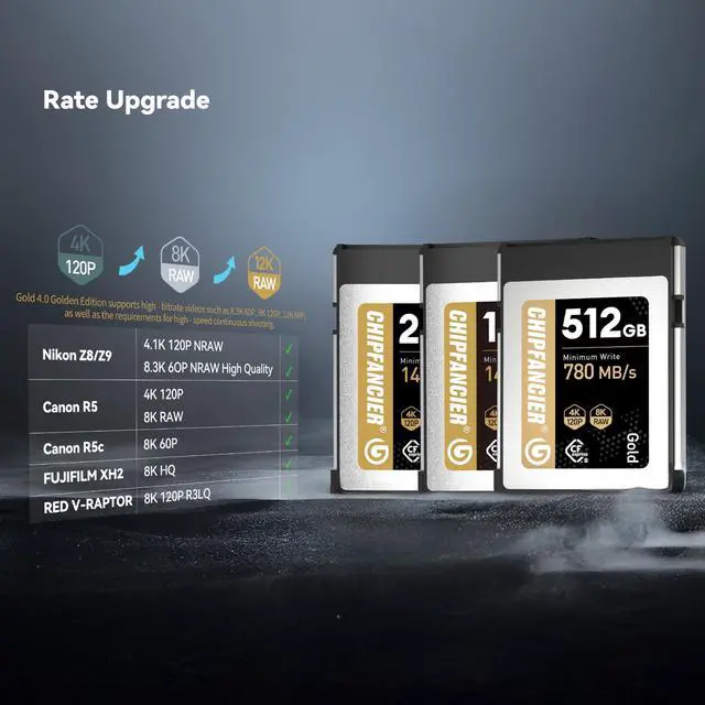 CHIPFANCIER CFexpress 2.0 Type B 512GB Memory Card Up to 1750MB/s Read 1420MB/s Write-Raw 8K Video Recording Compatible with Nikon D5/D6/Z7/Z9 Panasonic Canon EOS DJ for Photographers Gold