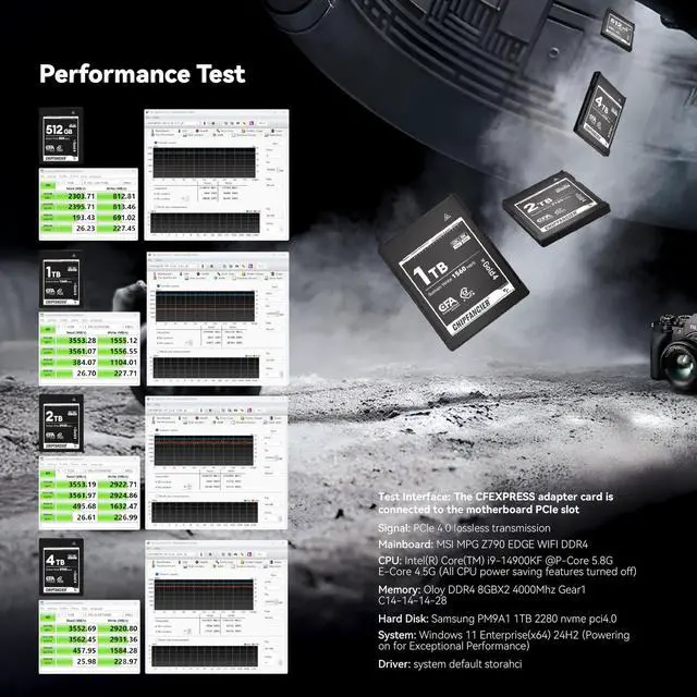 Normal Accessories: Whether your photography is your livelihood or lifes passion, you invested your time and money into it. Starting with your camera and blossoming to your flash, your stand, and your memory card. Make sure the accessories you surround yourself with match the passion you've poured into capturing your art. ^^ Advanced TechnologyAvailable in a range of capacities, CF Express Type B Memory Cards cater to different storage needs and preferences. Whether you are shooting 4K videos, high-speed bursts of photos, or 8K RAW image files, CFexpress B Cards deliver the speed and capacity required for efficient workflow. 8K video support may vary based on host device, file attributes, usage conditions and other factors. ^^ Reliability/DurabilityCFexpress 4.0 Type B memory cards are built with high-quality components and undergo strict testing to ensure their reliability. This makes them ideal for use in critical situations where data loss cannot be tolerated. CFexpress Type B memory cards are designed to be durable and resistant to physical damage, making them ideal for use in harsh environments. They are also weather-resistant and can withstand temperature changes.