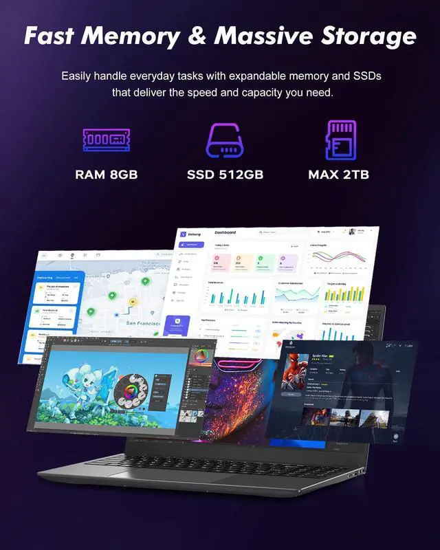 Speed & Storage: Equipped with 8GB RAM (Dual-Channel DDR4 - 3200MHz, Expandable up to 32GB) and 512GB M. 2 NVMe SSD, this Laptop delivers lightning-fast responsiveness and ample storage for documents, apps, and media. Experience near-instant boot-ups, rapid file transfers, and effortless multitasking. Expand storage up to 4TB via the M. 2 slot or TF card, ensuring youre never limited by capacity.