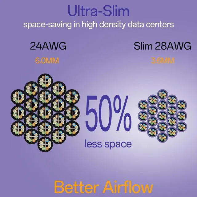 Ultra-Slim: Slim CAT6 patch cord is 50% thinner than standard networking cables. Slim Cat6 UTP patch cable is designed for space-saving in high density environments such as data centers telecommunication and server rooms.