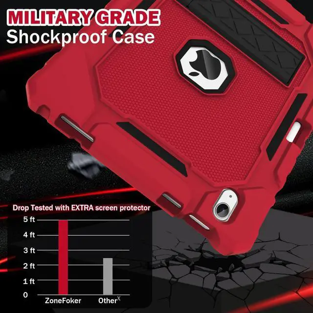 ZoneFoker Case for iPad (A16) 11th/10th Generation 11/10.9 inch 2025/2022, Heavy Duty Military Grade Shockproof Rugged Cover with Pencil Holder/Stand for i Pad 11th / 10 th Gen (Red+Black)