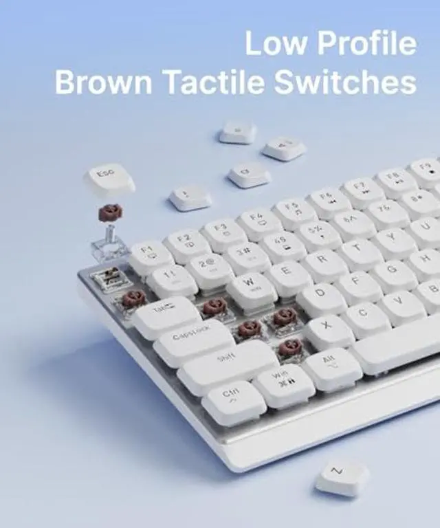 White Backlight & Metal Panel: The wireless low-profile keyboard features a stylish white backlight with a metal panel design, making your keyboard aesthetically pleasing. Smooth and delicate surface, and texture, easy to clean and scratch-resistant. 4 adjustable lighting levels and 20 preset dynamic lighting effects to switch between (Press FN & INS). Press FN & ESC to reset your keyboard lighting. When the backlight is turned on, the aesthetic mechanical keyboard wireless instantly looks brand new and awesome bright