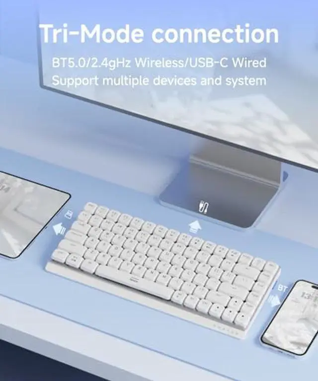 Tri-mode Wireless Keyboard: EWEADN MK84 wireless mechanical keyboard has three connection mode. Press and hold "FN" & "1/2/3/4/5" to switch between Bluetooth, 2.4G, and wired modes. Fit for gaming, work, or study, this wireless mechanical keyboard lets you connect effortlessly across multiple devices