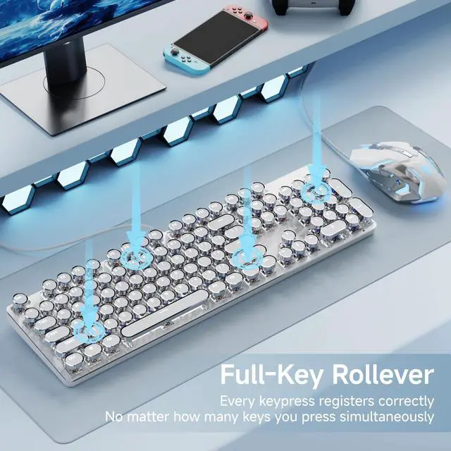 SEUNKWANG EWEADN TK100 Wired Typewriter Mechanical Keyboard and Mouse, 104 Keys Aesthetic Typewriter Keyboard Mouse Combo with White Backlit, Anti-Ghosting, Black Switch Cute Keyboards-White
