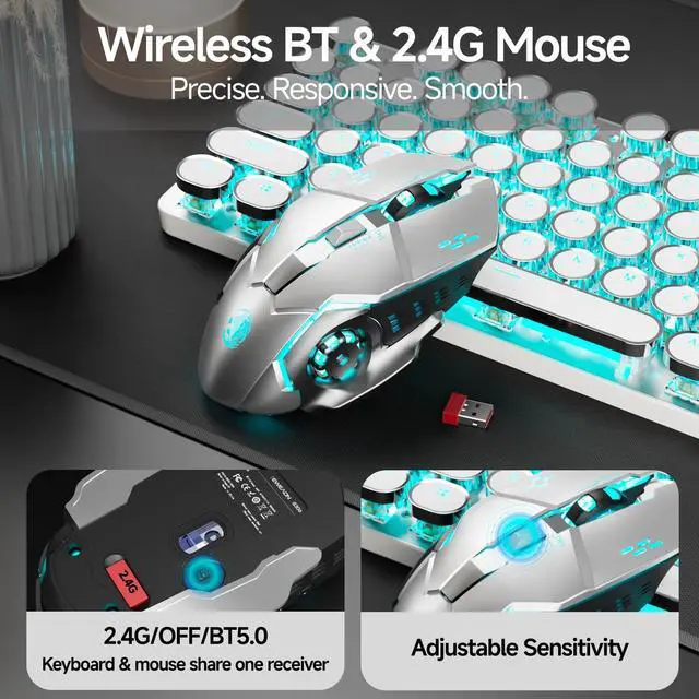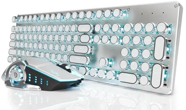Lighting Effects: The clicky keyboard cute wireless adopts 104-key anti-ghosting technology, and allows multiple keys to be pressed at the same time without conflict. The office is more efficient and games are smoother. The retro typewriter keyboard can adjust 19 lighting effects, including 14 basic effects and 5 game lighting effects. Also, this cute keyboard USB adopts an ergonomic design and is also an excellent typing tool for office work ^^ Aesthetics and
