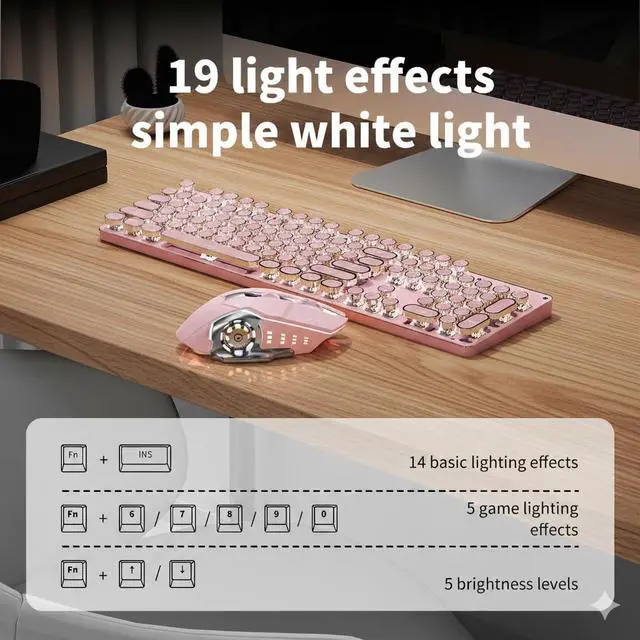 Light Effects: Crafted with an aluminum alloy metal panel, this light-up keyboard wireless is scratch-resistant and durable. The sleek metal finish elevates the pink wireless keyboard and mouse aesthetic, enhancing 19 dynamic light modes. Use FN+INS to customize your aesthetic mechanical keyboard and mouse combo for a stunning glow ^^ High-Precision