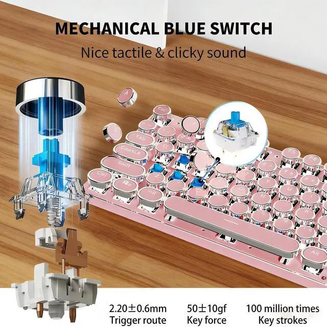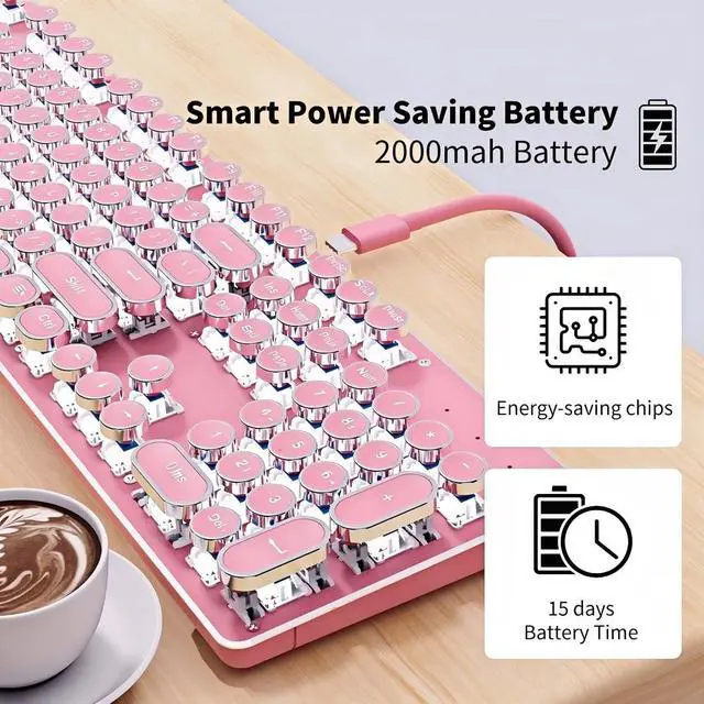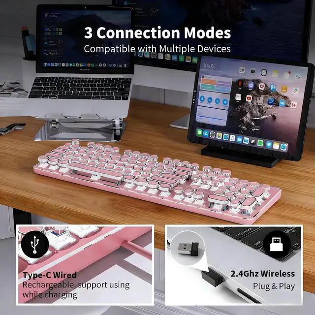 Connectivity: The TK950 retro typewriter keyboard and mouse combo supports Bluetooth 5.0, 2.4GH z, and USB-C wired modes. This wireless typewriter keyboard pairs with up to 5 devices simultaneouslytoggle between your tablet, laptop, and phone via FN+1/2/3/4/5. Perfect for seamless switching between work and gaming ^^ Retro Punk Style & Clicky Blue Switches: Merging vintage style with modern tech, our wireless typewriter keyboard features round "punk" keycaps for a unique touch. Professional blue switches deliver the signature sound clicky keyboard cute wireless fans crave, ensuring responsive and satisfying typing for hours ^^ Premium Metal Panel & 19