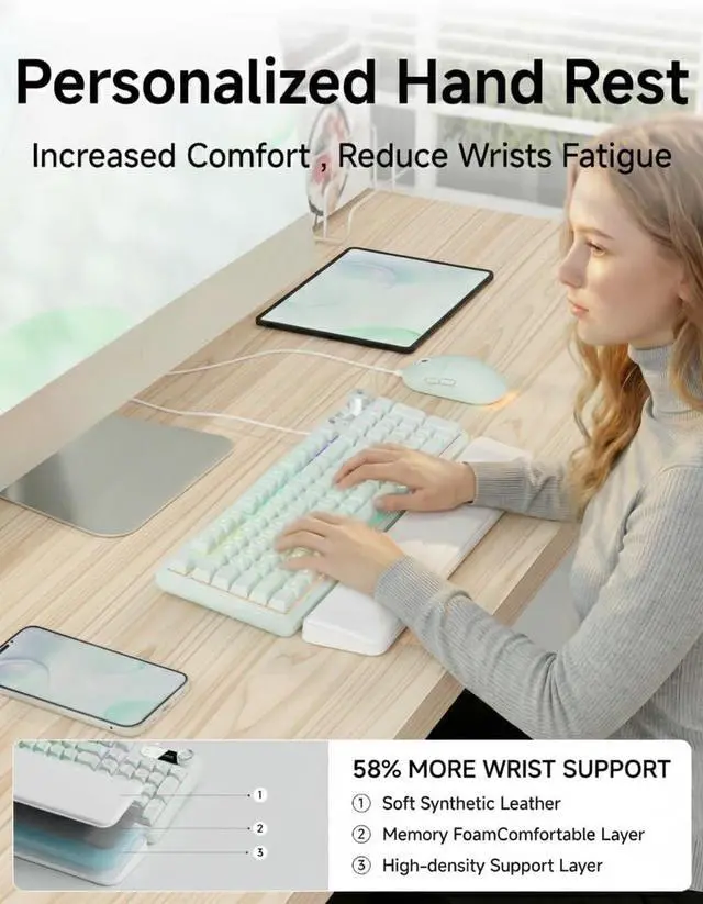 Ergonomic Geometry: Maximize your output without the fatigue. This C98 keyboard and mouse ecosystem features a detachable, plush PU leather wrist support engineered to align perfectly with your natural typing angle. From high-stakes gaming marathons to 8+ hour professional shifts, the ergonomic cushioning absorbs joint pressure. This specialized pink keyboard and mouse setup ensures that every keystroke delivers a premium tactile feel, keeping you focused and pain-free from clock-in to log-off ^^
