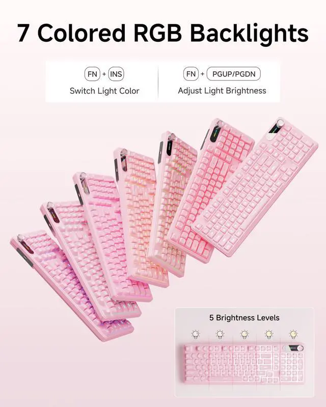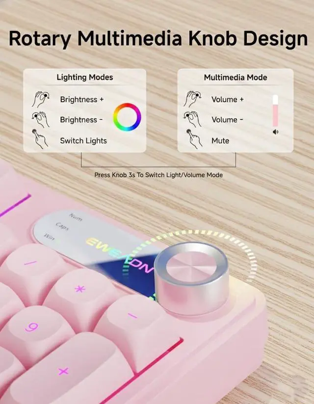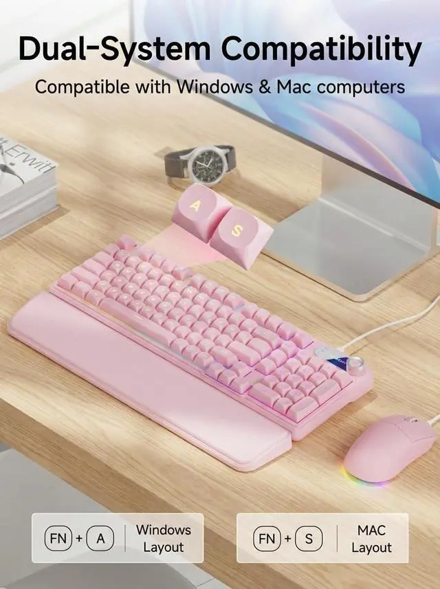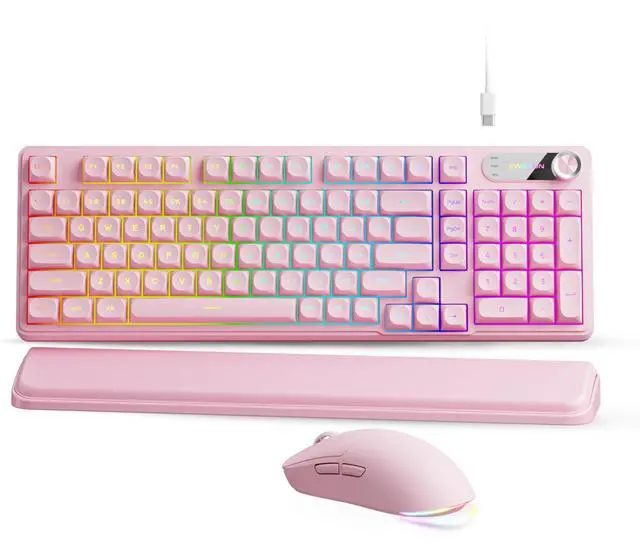 Dual-Function Multimedia Smart Knob: Take total command with the C98 pink keyboard and its integrated smart rotary dial, a centerpiece designed for a high-speed multitasking workflow. Seamlessly toggle between Lighting Modeadjusting brightness and effects with a simple twistand System Volume Mode via the FN+Knob shortcut. Whether youre muting a call in a split second or dialing in the perfect volume, this USB keyboard offers a tactile interaction that keeps your hands on the keys and your eyes on the goal ^^ Real-Time Display Screen & Whisper-Quiet Keys: Eliminate the guesswork with a built-in display screen that provides at-a-glance status updates on your active settings. Both the mouse and the quiet-touch keyboard and mouse are precision-engineered for a low-profile, noise-dampening task execution, making them the premier choice for late-night home studios or professional open offices. The companion wired mouse features 4 adjustable DPI levels (up to 4800), ensuring your tracking is as sharp as your focusall while remaining virtually inaudible to those nearby ^^ True Plug-and-Play & Universal OS Bridge: Forget complex drivers; this keyboard and mouse wired combo is ready to perform the second it hits your USB port. Tailored for the modern multi-device lifestyle, it features dedicated FN+A/S shortcuts for effortless transitioning between Windows and macOS environments. Fully compatible with PCs, laptops, and Mac workstations, this keyboard provides the ultimate operational utility for users who demand reliability across every platform they own