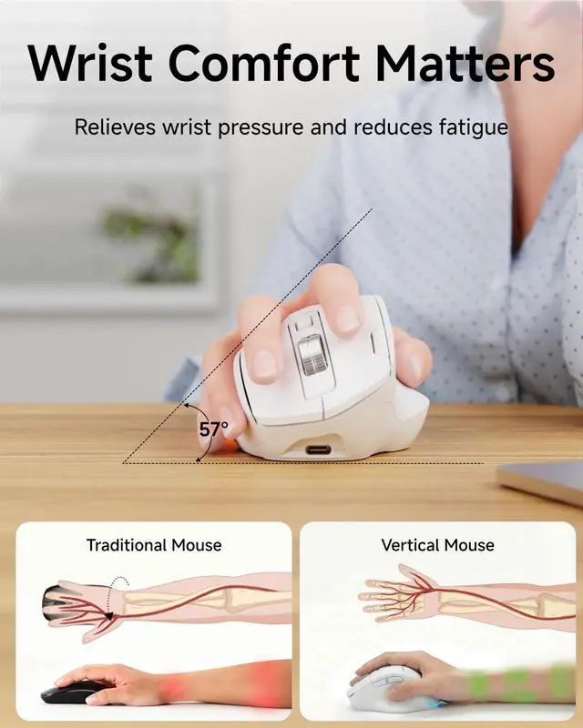 ALL-DAY COMFORT & ERGONOMIC SUPPORTDesigned exclusively for right-handed users, this wireless mouse promotes a natural handshake position. It naturally contours to your palm, effectively minimizing wrist strain and muscle fatigue during long hours of office work or browsing. Say goodbye to the discomfort of traditional flat mice and upgrade your daily setup. ^^ SEAMLESS TRI-DEVICE CONNECTIONBoost your productivity with advanced Bluetooth and 2.4G USB dual-mode connectivity. Easily pair with up to 3 devices simultaneously (2 via Bluetooth, 1 via USB) and switch between your laptop, desktop, and tablet with a single click.