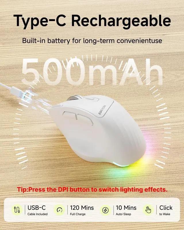 (Note: The USB receiver is conveniently stored at the bottom). ^^ HIGH-PRECISION TRACKING & DYNAMIC RGBEquipped with a high-performance optical chip, this computer mouse offers 5 adjustable DPI levels (800/1600/2400/3200/4000) for smooth, precise tracking across various surfaces. An intuitive indicator light flashes to confirm your DPI setting. Plus, the subtle RGB tail light adds a modern touch to your workspacesimply long-press the DPI button to easily switch between dynamic lighting effects and personalize your setup without being visually distracting. ^^ ULTRA-QUIET CLICKS FOR DEEP FOCUSStay completely focused on your tasks without disturbing those around you. Featuring whisper-quiet buttons that reduce click noise by up to 90%, this silent mouse delivers a satisfying tactile feel. It is the perfect companion for shared workspaces, late-night studying, libraries, or coffee shops. ^^ TYPE-C RECHARGEABLE & SMART POWER SAVINGSay goodbye to the hassle of disposable batteries. The built-in 500mAh high-capacity battery provides weeks of reliable use on a single charge via the included USB-C cable. To maximize battery life, the Bluetooth mouse automatically enters deep sleep mode after 10 minutes of inactivitysimply click any button to instantly wake it up.