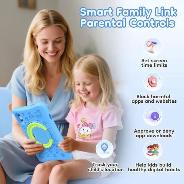 Android 14 Operating System Tablet With Parental Controls + Ships With Premium Curated Gift Box For Kids, Android tablet This 2025 toddler tablet runs on Android 14, kids learning tablet offering smooth performance and advanced parental control settings. Let kids explore learning apps, videos, and games with screen time limits and content filters. Parental control for baby child kid toddler age 3 years old ^^ Kid Blue Eva Shockproof Case Durable, Lightweight, Drop Proof Built For Baby Little Hands, The academy tablet educational tablet easy to grip texture and soft rounded edges are perfect for small hands, included the built in portable foldable stand allows for hands free use during learning, video calls, or entertainment time.