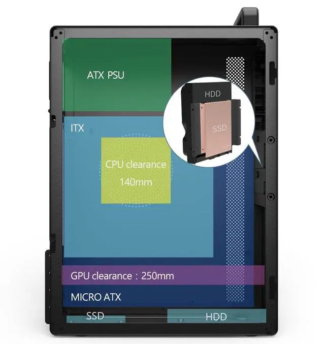 Hardware capability: HDD*2+SSD*2 Supports VGA Cards up to: 250mm Maximum height of