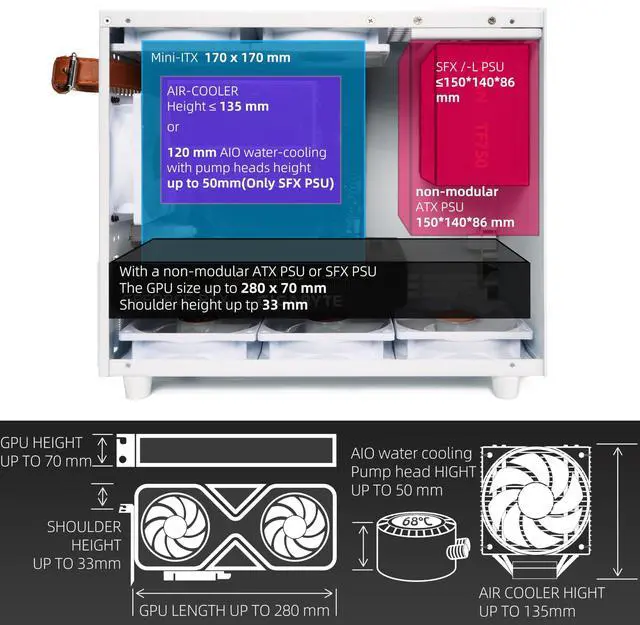 . When paired with an ATX PSU, it can support non-standard mATX motherboards up to 225 x 186mm ( 8.86" x 7.32" ). ^^ Optimal Cooling DesignCompatible with SFX (up to 125 x 140 x 64 mm) or ATX (up to150 x 140 x 86 mm ) PSU, and supports air coolers up to 135mm in height. When paired with an SFX power supply, it can accommodate a air coolers up to 135mm or 120mm AIO liquid cooler with pump heads up to 50mm. ^^ GPU CompatibilitySupporting GPUs up to 70mm ( 2.75" )