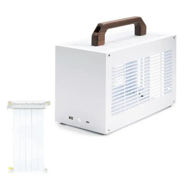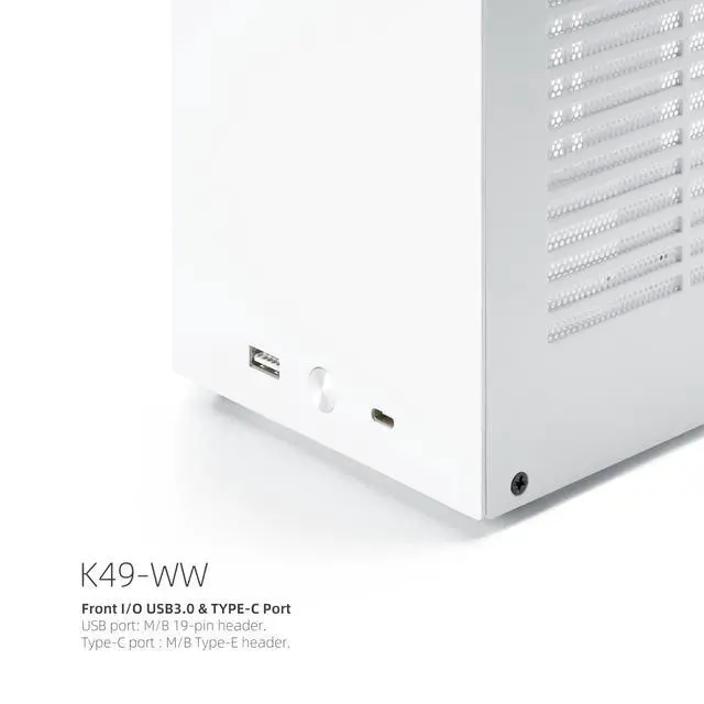 NOTEThis item includes a wooden handle and a Special-Designed silver PCIE 3.0 Riser Cable (SG01) ^^ SizeThe K49WW Mini ITX case measures 151 x 306 x 179 mm (6" x 12" x 7"), with a volume of 8.3L. It comes with two carrying handles (one plastic handle and one PU leather handle), making it easy to move or fit into a backpack ^^ Material QualityThe K49WW is made of high-quality 1.5 mm SPCC steel, ensuring durability and strength. It features an upgraded surface painting process compared to the K49. In addition to the 2 original SPCC side panels, it includes an extra 3mm acrylic ventilated side panel ^^ Front I/OEquipped with a USB port (connected to the motherboard's 19-pin header) and a Type-C port (connected to the motherboard's Type-E header) on the front panel, meeting the needs for high-speed data transfer and charging ^^ Motherboard and PSU CompatibilityThe K49WW supports only standard ITX motherboards with a maximum size of 170x170mm and SFX PSUs with a maximum size of 125x100x64mm (SFX-L PSUs are not compatible) ^^ Optimal Cooling DesignThe K49WW features excellent thermal performance.