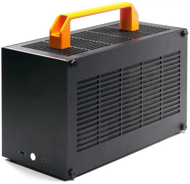 TIPSThis item does not include GPU riser cable, you need to purchase an additional 18.5 cm Dual Reverse Connectors riser cable. ^^ Size The K49-BL Mini ITX case measures 151 x 306 x 179 mm (6" x 12" x 7"), with a volume of 8.3L. It comes with two carrying handles (one plastic handle and one PU leather handle), making it easy to move or fit into a backpack. ^^ Material Quality The K49-BL is made of high-quality 1.5 mm SPCC steel, ensuring durability and strength. It features an upgraded surface painting process compared to the K49.
