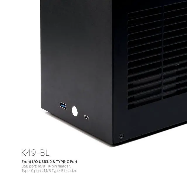 In addition to the 2 original SPCC side panels, it includes an extra 3mm acrylic ventilated side panel. ^^ Front I/O Equipped with a USB port (connected to the motherboard's 19-pin header) and a Type-C port (connected to the motherboard's Type-E header) on the front panel, meeting the needs for high-speed data transfer and charging. ^^ Motherboard and PSU Compatibility The K49-BL supports only standard ITX motherboards with a maximum size of 170x170mm and SFX PSUs with a maximum size of 125x100x64mm (SFX-L PSUs are not compatible). ^^ Optimal Cooling Design The K49-BL features excellent thermal performance.