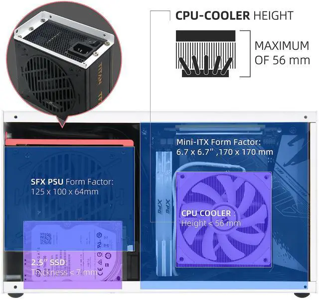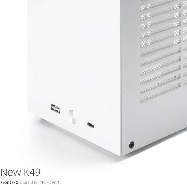 ^^ Front I/OEquipped with a USB port (connected to the motherboard's 19-pin header) and a Type-C port (connected to the motherboard's Type-E header) on the front panel, meeting the needs for high-speed data transfer and charging. ^^ Motherboard and PSU CompatibilityThe K49 supports only standard ITX motherboards with a maximum size of 170x170mm and SFX PSUs with a maximum size of 125x100x64mm (SFX-L PSUs are not compatible). ^^ Optimal Cooling DesignThe K49 Series Chassis features excellent thermal performance. It supports CPU air coolers with a height of 56mm 2.2". Combined with the highly ventilated side panel, it delivers exceptional cooling efficiency even without installing case fans.