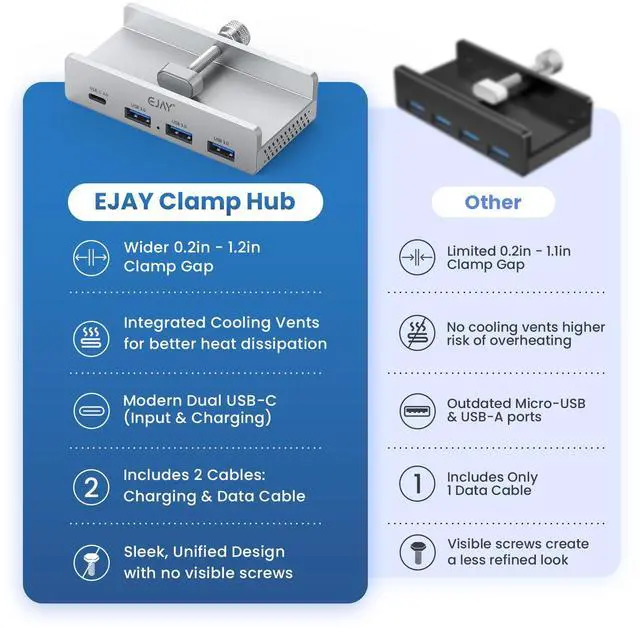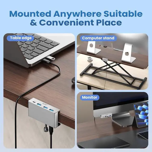 Innovation Design-No More Sliding: Adajustable Clamp Hub,Replace traditional USB Hub which with the disadvantages of sliding everywhere,hard to plug and unplug and take up space,the new design Hub can fit the thickness from 0.2 to 1.2 inches (5-30mm)extended the USB fuction from host to desk, install the hub where you need at a convenient place,enjoy the stable data transmission more easier and no need to squat down the table to connect every device
