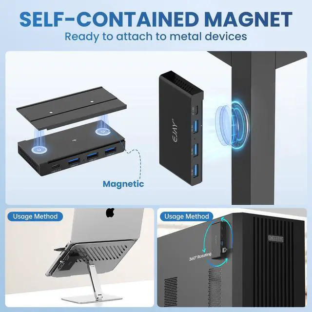 EJAY 4-Port Magnetic USB Hub Expand your laptop with 3× USB 3.0 + 1× USB-C (5Gbps speeds). Features strong magnets for secure attachment, 3 mounting options (magnetic snap, residue-free sticky pads, or 2 packs sliding rail + screws), and a sleek aluminum design. Compatible with MacBook, Dell, HP, Surface Pro & more.
