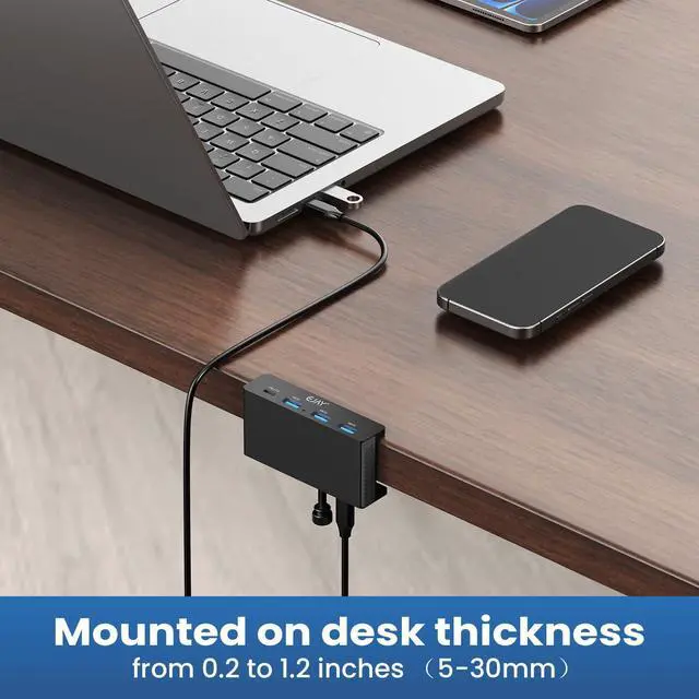 Innovation Design-No More Sliding: Adajustable Clamp Hub,Replace traditional USB Hub which with the disadvantages of sliding everywhere,hard to plug and unplug and take up space,the new design Hub can fit the thickness from 0.2 to 1.2 inches (5-30mm)extended the USB fuction from host to desk, install the hub where you need at a convenient place,enjoy the stable data transmission more easier and no need to squat down the table to connect every device