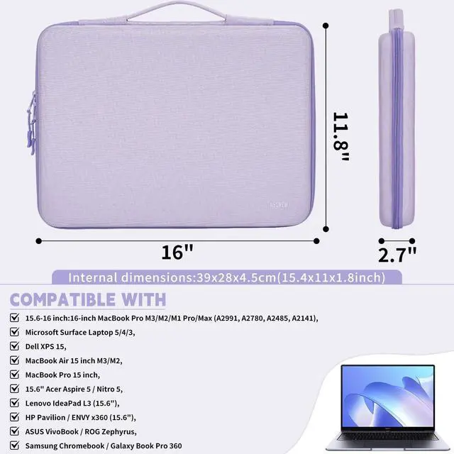 Wide CompatibilityThis laptop case fits most 15"-16" devices.Compatible with 16-inch MacBook Pro M3/M2/M1 Pro/Max (A2991, A2780, A2485, A2141),Microsoft Surface Laptop 5/4/3,Dell XPS 15,MacBook Air 15 inch M3/M2,MacBook Pro 15 inch,15.6" Acer Aspire 5 / Nitro 5,Lenovo IdeaPad L3 (15.6"),HP Pavilion / ENVY x360 (15.6"),ASUS VivoBook / ROG Zephyrus,Samsung Chromebook / Galaxy Book Pro 360 and other 15-16 inches laptops, notebooks, and ultrabook