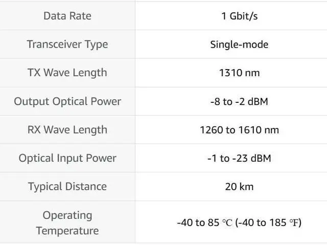 Compliant with IEEE 802.3 z ^^ 1310nm Single-mode, 1000Base-LX ^^ 20km transmission distance ^^ 1.0625G bd Fiber Channel/ 1.25 Gigabit Ethernet ^^ Differential LVPECL inputs and outputs ^^ TTL signal detect indicator ^^ Class 1 laser product complies with EN 60825-1 ^^ Wide operating temperature -40 to 85