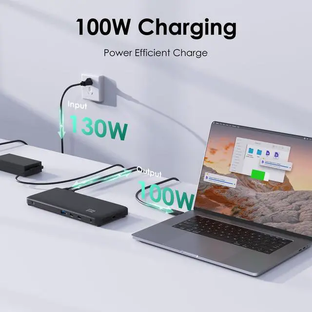 100W Fast Charging: When paired with a 130W power adapter, this docking station delivers up to 100W of safe and rapid charging for connected laptops. Quickly recharge your device while displaying content or transferring data, eliminating battery anxiety for low-power situations. Note: Ensure your device's USB-C port supports the Power Delivery protocol.